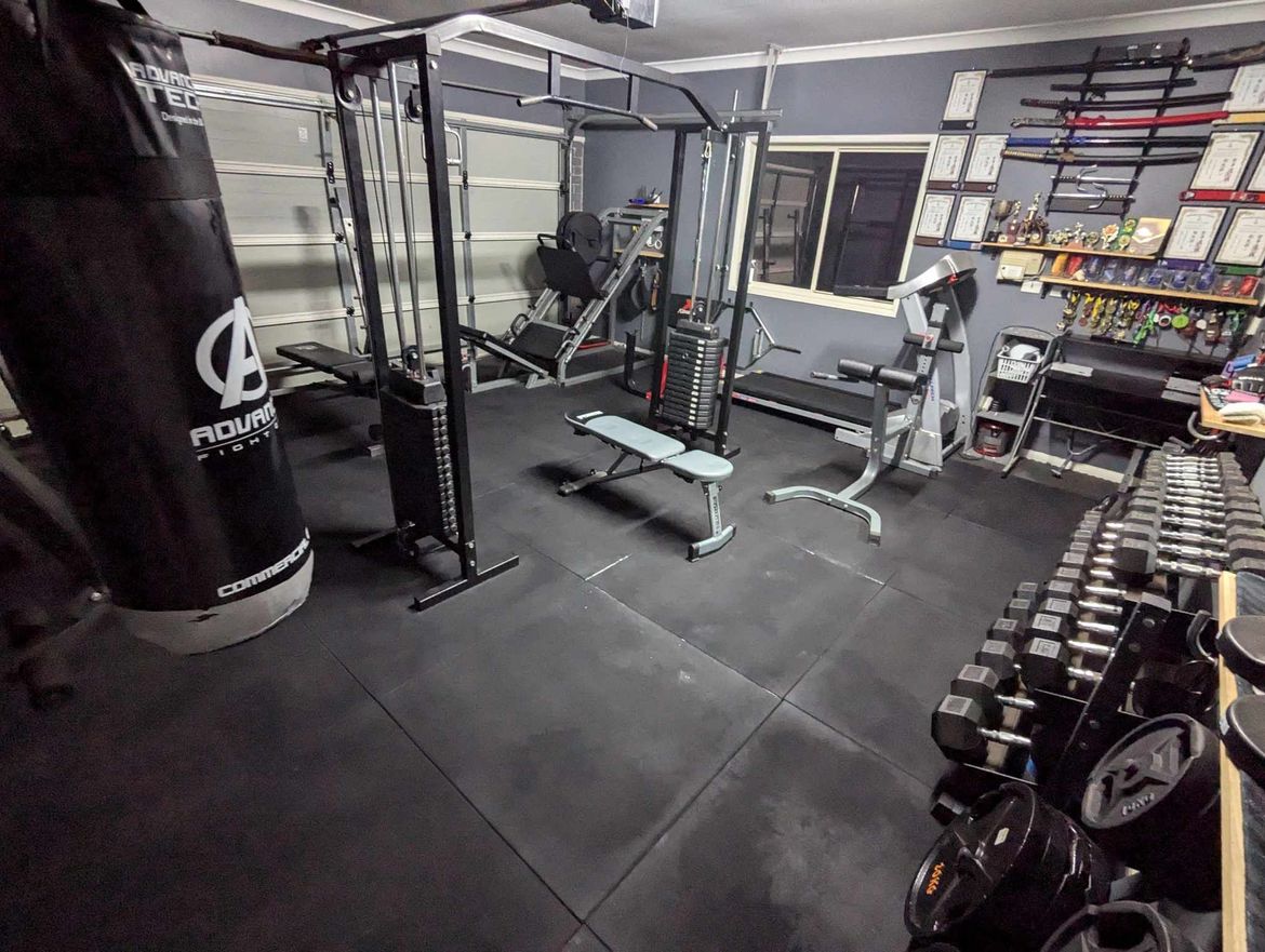 As of 2025, the gym is still going strong, although the flooring over time began to show the effects of everyday use and the intense QLD summer, with the mats expanding and contracting into misaligned conditions. To remedy this, I found some excellent 1x1 metre 15mm rubber commercial gym mats to replace them for cheap from a small local gym looking to replace their own mats. While I miss the colour in the centre of the room, the quality improvement is outstanding, gives that "gym smell" and feels great underfoot.