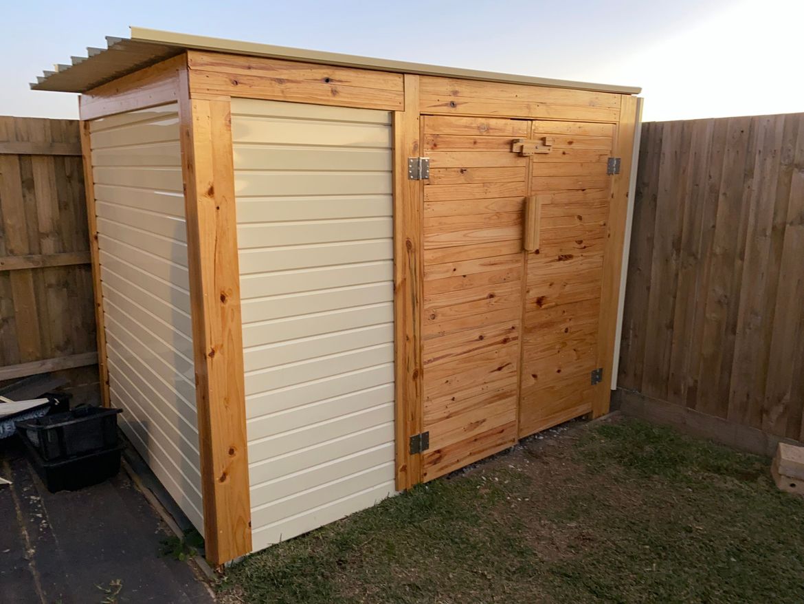 A simple garden shed that was built entirely from scrap Centenary carport components. I used 108x65 box beams as posts (although one is 158x65). Walls and roofing are made from centenary C-Deck and trimmed in wooden panels made from pallet wood. The doors are made entirely from pallet wood.