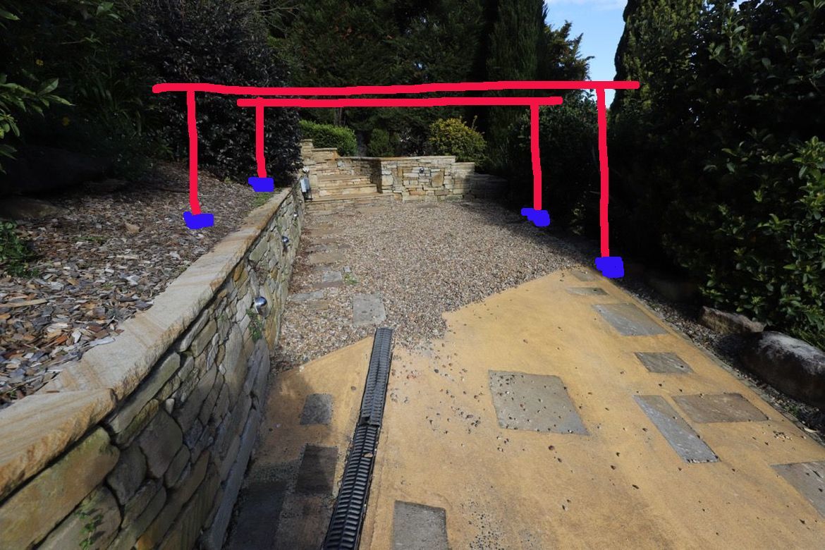The pebble area is not big enough unfortunately (4.5m in length on shorted side), so the post will sit into the existed concrete.