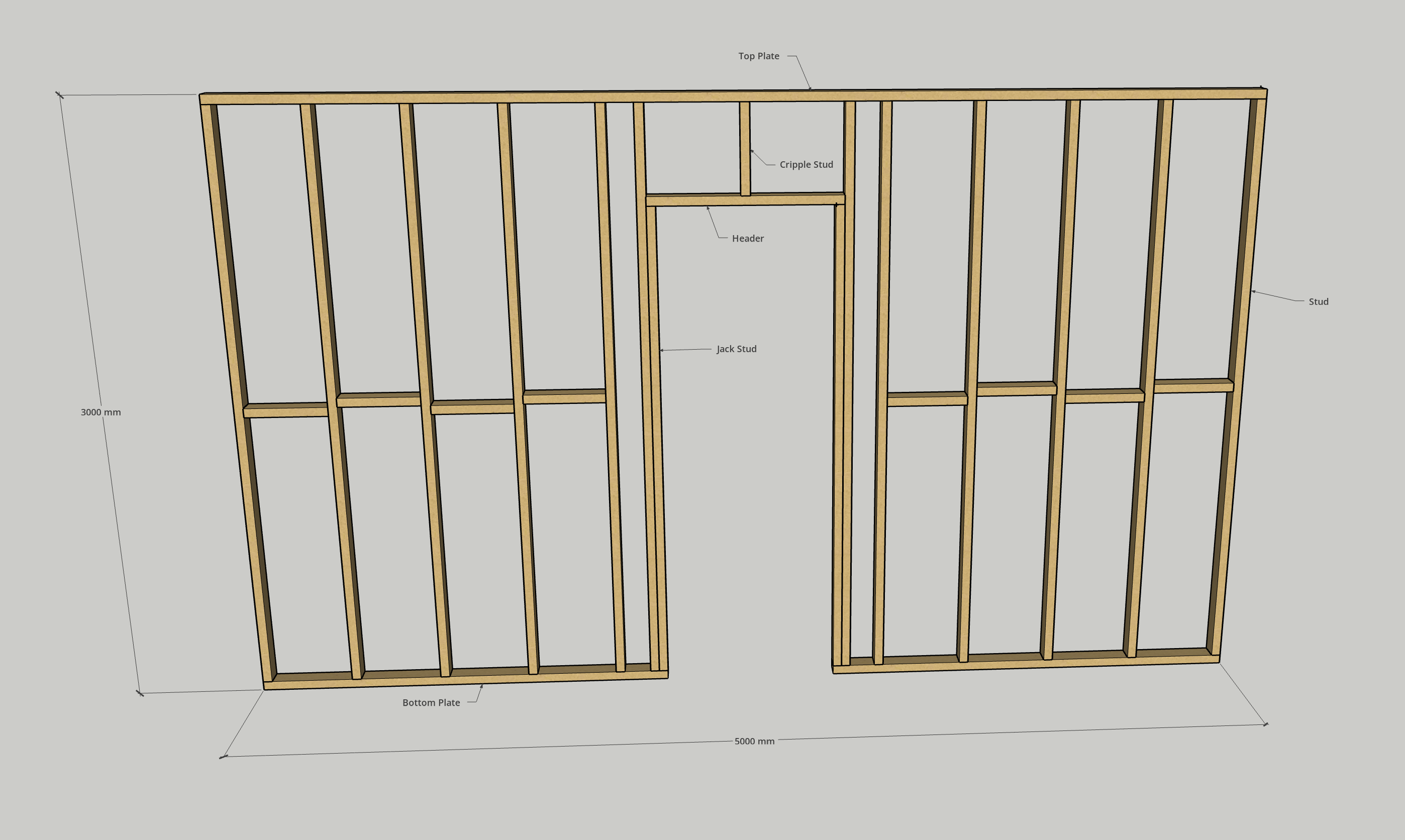 For a wall that is 3m tall by 5m wide with a door in the middle, you will need a top and bottom plate, 12 full-height studs, two king studs (a bit taller than the height of the door), a header which is the width of the door, noggins and a cripple stud (sits above the door).