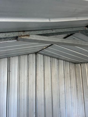 2. The light you can see through the top sections of the roof that others have noted is very normal in both shed and even more substantial metal roof designs. So, unless rain is obviously entering here, then this isn't the source of your issues.