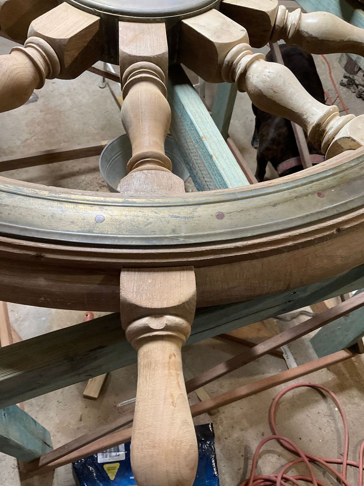 I’m told by the maritime museum that the wheel is approximately 200 years old but the previous owner painted it with lead paint and my thoughts are that a ships wheel that old should not have been painted just left in it’s natural state or a timber stain.