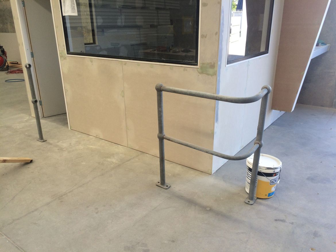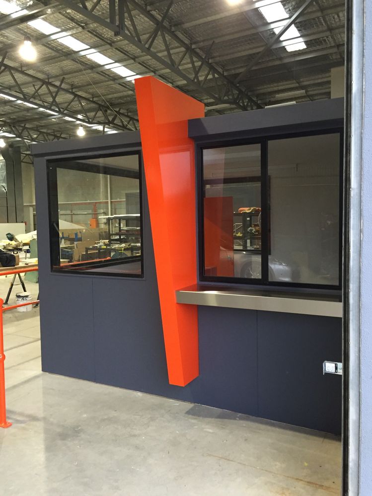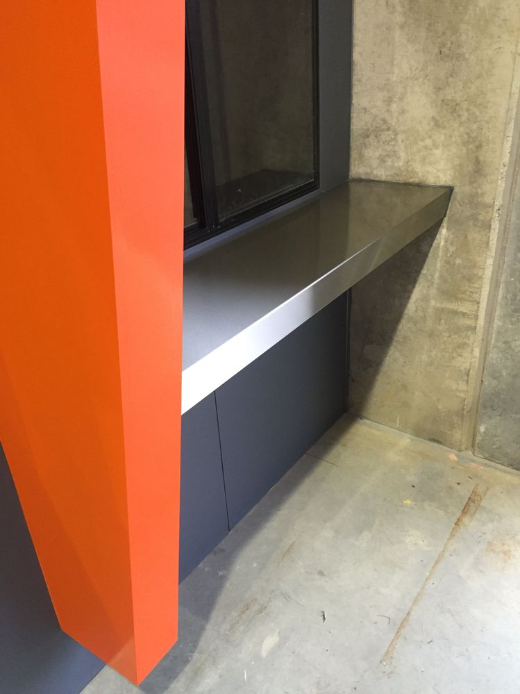 Dark Grey generic paint Standard size sliding aluminium windows, 2 pac orange feature panel with stainless steel shelf at delivery and enquiries desk