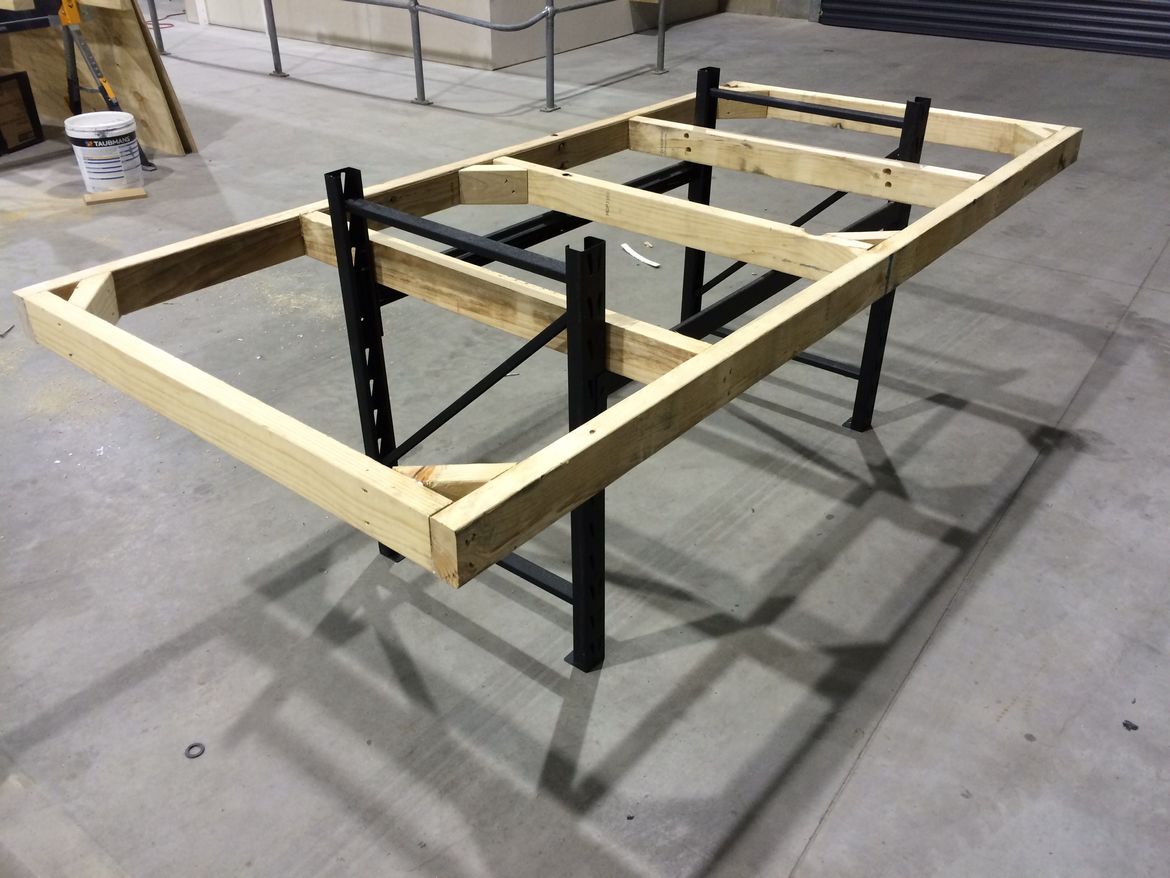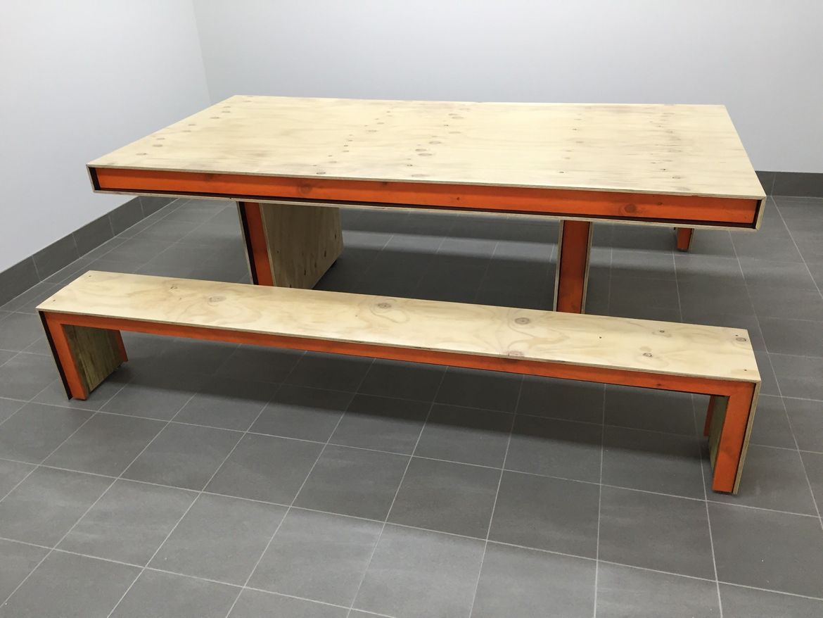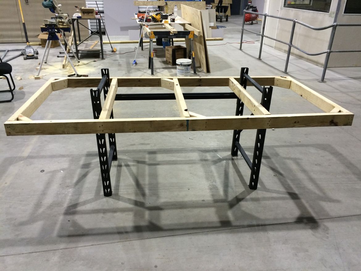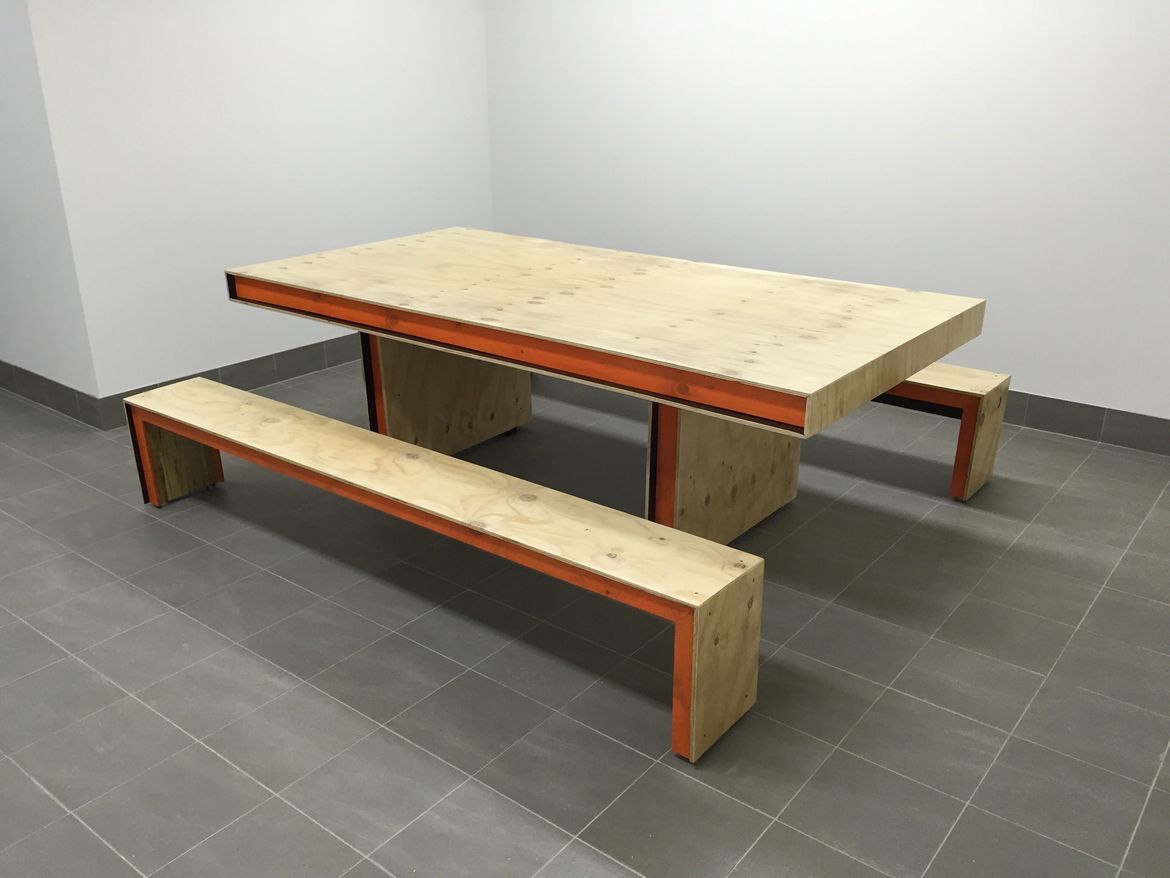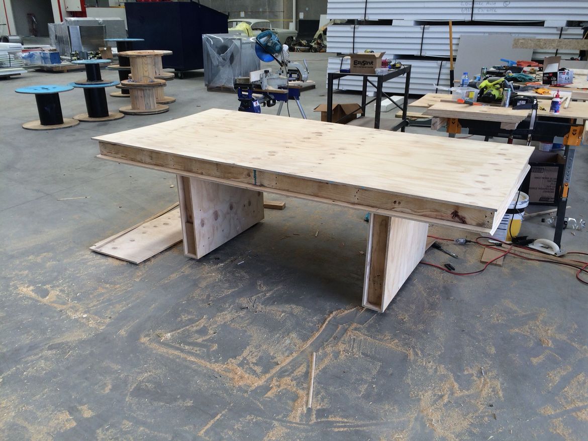 Table for da boys, morno and lunch, made from a bunnos shelfing rack and low grade plywood used to box and crate equipment delivered to shop, would have been thrown out anyway No drawings on da fly, freestyle