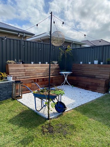 We have a small backyard in a new housing estate so there is little room for anything too extravagant. We have turned this blank landscape into our beautiful Tuscan inspired garden oasis. The look was completed with many Bunnings products and plants. This project has taken us approx. 10 months to complete in small stages (as we both work) we have put our weekends into our project.