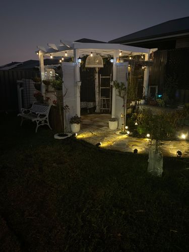 We have extended the deck off our alfresco, added sandstone garden beds and paths, created a fire-pit area with merbau pew seating, built an rose arbour and hung festoon solar lights to create the magical effect at night.