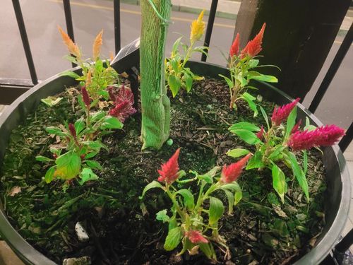 The first picture is Dragons Breath - Celosia plumosa. It is an extra-large, late flowering Celosia, producing an abundance of vibrant red foliage with large plume-type blooms that are most attractive and stand out against a garden-scape. Your second picture appears to be a Hummingbird Mint - Agastache morello. It is a hardy perennial plant with tall stems sporting soft, bright pink flowers with deep maroon bracts. It has small, grey-green foliage and prefers a sunny position in well-drained soil.