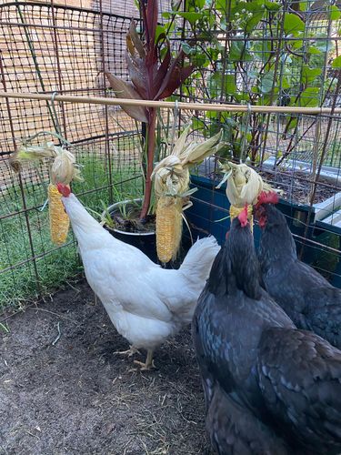 I hang treats off the fence for the Chooks , but added a few bamboo stakes and hooks to make it even more interesting for the girls. They do free range in the afternoons but during the day in the run they need to be stimulated 🐓🥰