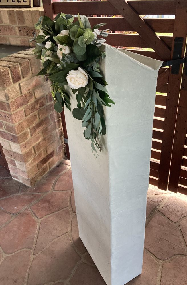 Wanted to make a Podium for my Wedding but didn't want to spend a heap of money and wanted to use what i had left over from other projects... This was made from boxes i picked up from Bunnings, Polyfilla, glue, masking tape, paint and a heap of greenery