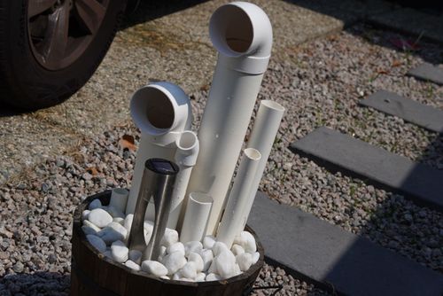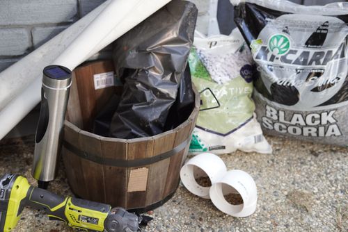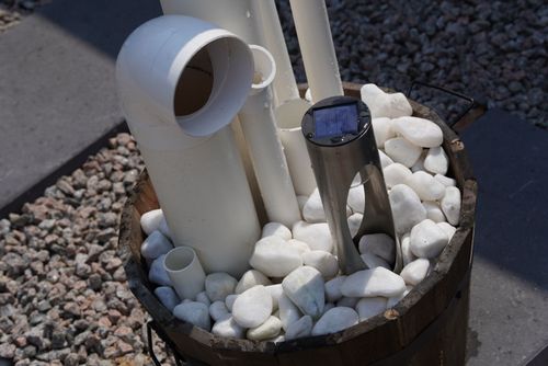 Step 4: Open up the bag of larger, decretive pebbles and fill the remaining barrel space to be level (or level-ish). I placed one or two stones into each pipe and solar light as well to be consistent.