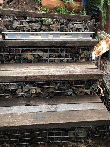 Removed the middle stringer from the top step, as there was too much flex in the spirals for my liking so fill with smaller gravel and rocks to create a firm footing. It worked beautifully.
