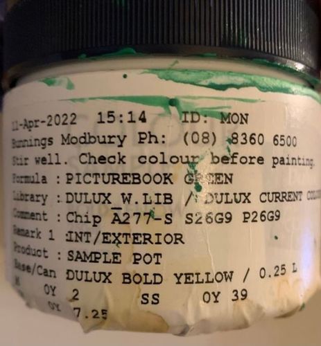( The colour is Picture Book Green, Dulux , says on the container, base, Dulux bold yellow.
