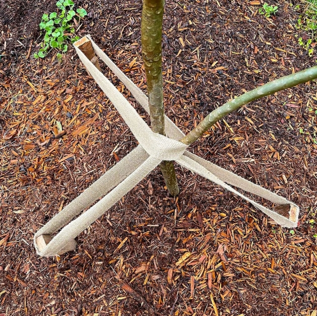 The Jute Webbing can be held in place using heavy duty staples. My best advice is not to overtighten the support web on the tree. I've placed an image below to give you an idea of how it can be done.