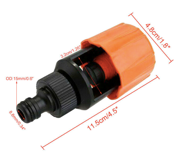 The fitting in your picture appears to have a standard male click-on fitting. Your Holman 12mm x 30m Yardmate Garden Hose comes with a standard female click-on fitting attached to the hose. I've highlighted it below. These are both 15mm fittings and should click together.