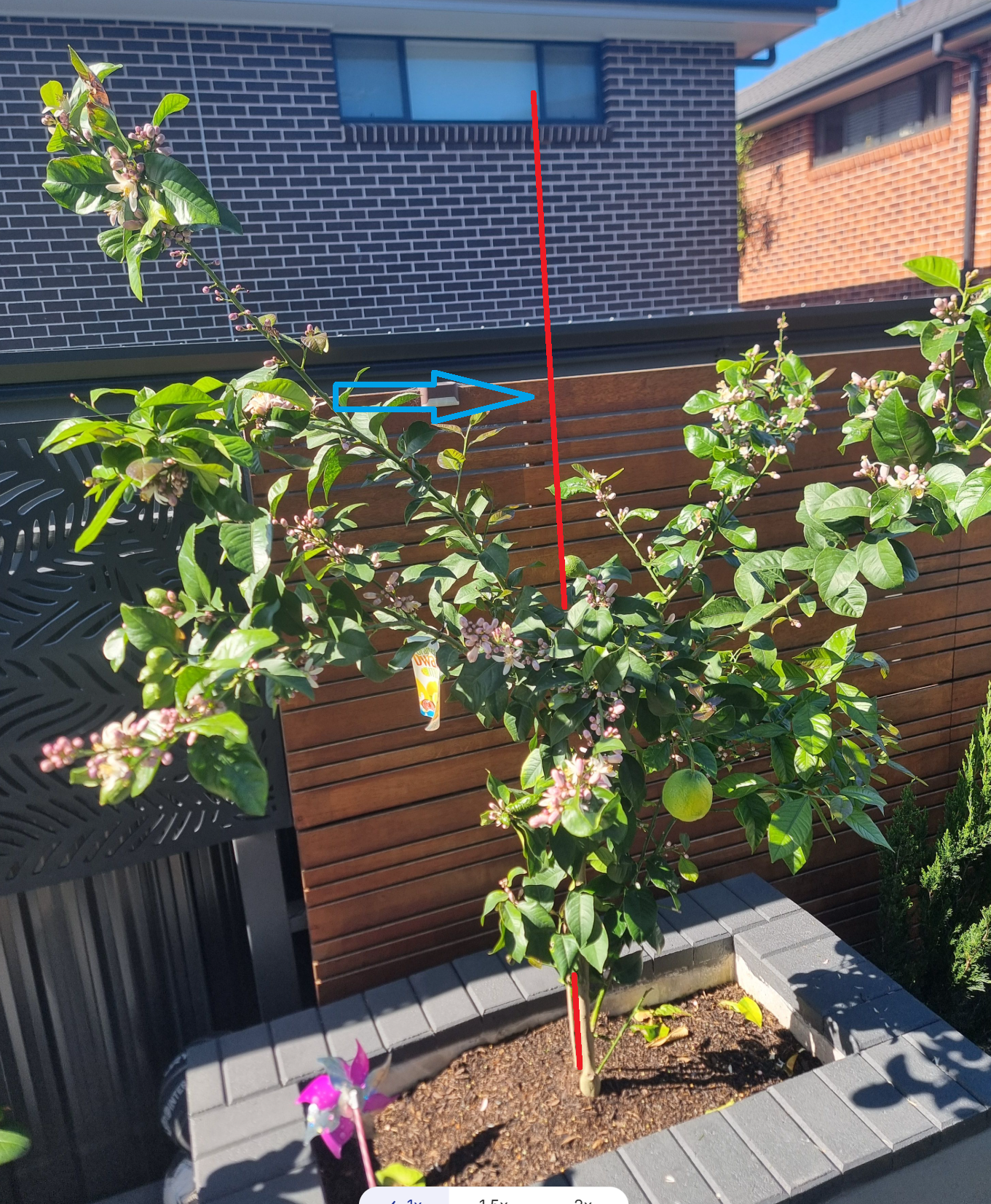 As for the flowers, with a healthy, well-watered, and nourished tree, it should set fruit naturally. You can thin some flowers or early small fruit if the tree seems overloaded. This helps the remaining fruit grow bigger and prevents the branches from being weighed down too much. Fertilising with a citrus-specific fertiliser will also support both growth and fruiting.