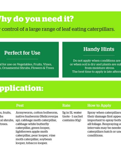 Yates Nature's Way Dipel is a wonderful product. Firstly I love it as it doesn't affect beneficial insects like bees and ladybirds and secondarily because it is very effective. I've constantly recommended it ever since I had a customer come back to let me know that they had applied it the previous night, and in the morning, there were hundreds of green looper caterpillars dead on the ground.