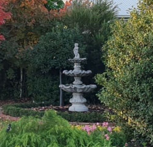 Traditionally these concrete fountains were installed onto a concrete reservoir base which acts as the pond section. If this ornament was already there previous to your occupation, please check to see if there is a concrete base/reservoir located under the soil. It is quite common for these to fill up with debris over the years and become buried.