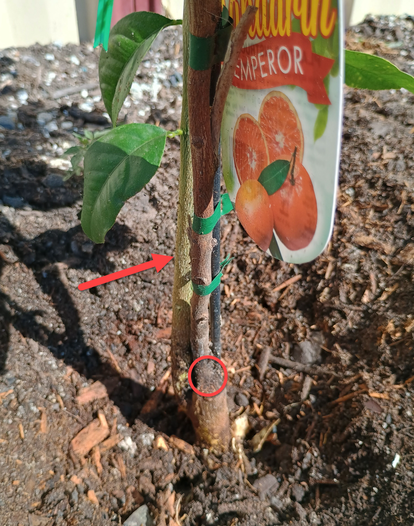 Please find the images as required. The brown stem attached to the stake (circled yellow) has no growth, no leaves, looks dried to me. Only the other stem (circled green) from the graft has growth. Please advise whether I should cut off this stem as well or not and the plant is alive?!.