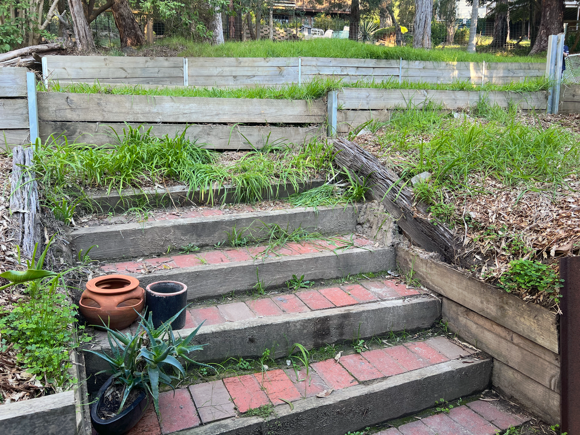 I'm primarily concerned with the retaining aspects as my whole block is on a slope. Sleepers on the back wall here don't go all the way down - what you see is all there is, so anything below that is only being held up by the individual steps. If I construct new steps, I'm not sure how to best tie them back so they don't fall forward under the weight.