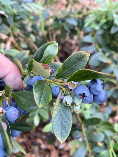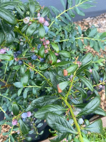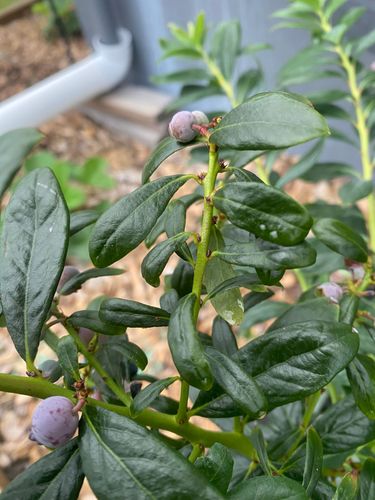 Overall, your plant looks quite healthy, with significant amounts of fruit. I note none of the mature fruit are wrinkling as that would be a significant concern. Occasionally, blueberry fruit can shrivel if the plant is not getting adequate water. Blueberry bushes thrive in soil that is consistently moist but not waterlogged. It’s important to strike a balance—keeping the soil constantly soggy can lead to root rot, while allowing it to dry out too much can stress the plant and cause leaf issues like curling or wrinkling.