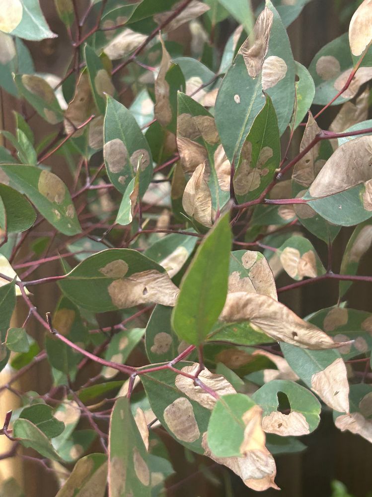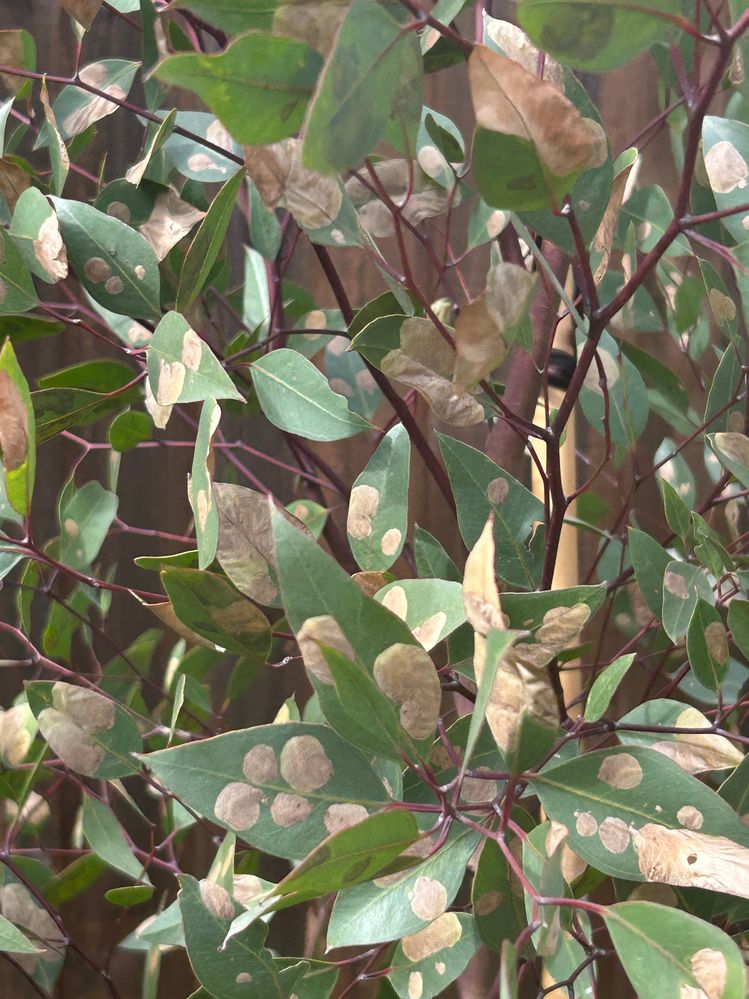 The brown patches on your eucalyptus leaves are most likely caused by a fungal disease, commonly known as leaf spot, rather than sun damage or overwatering. The appearance of tan to brown irregular spots, some with a grey or papery centre, is characteristic of fungal infections like Mycosphaerella species, which are particularly common in eucalyptus trees exposed to humidity or poor airflow.