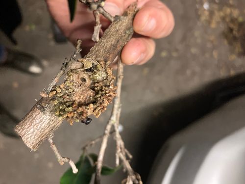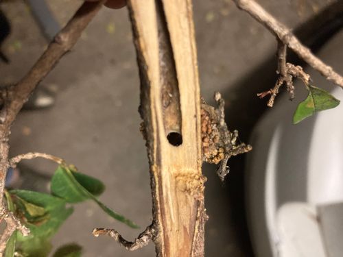 Hi there, my very well established Lilly pilly tree seems to have some sort of borer. See images below. You can see the frass and the hole made by the borer. The tree still looks healthy but I think birds are breaking off smaller branches to eat the larvae. Any ideas 1. What it is and 2. How to treat? Thanks! I love this tree and would be devastated to loose it!