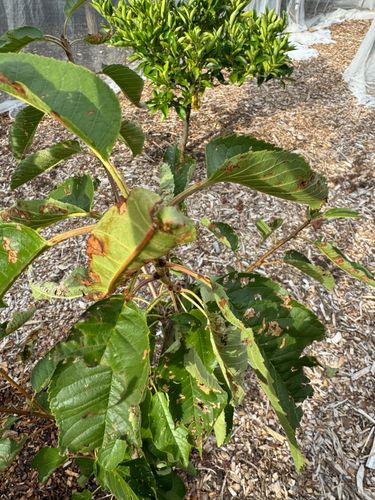 Something is putting holes in the leaves of my cherry tree. Any ideas and advice welcome. I water it and feed it …