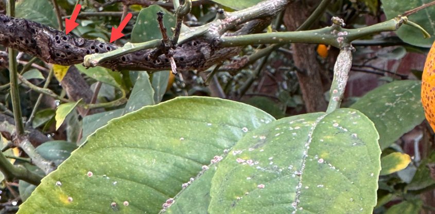 Then there are these holes in the branch, which are likely caused by a different insect, potentially gall wasps or borers.