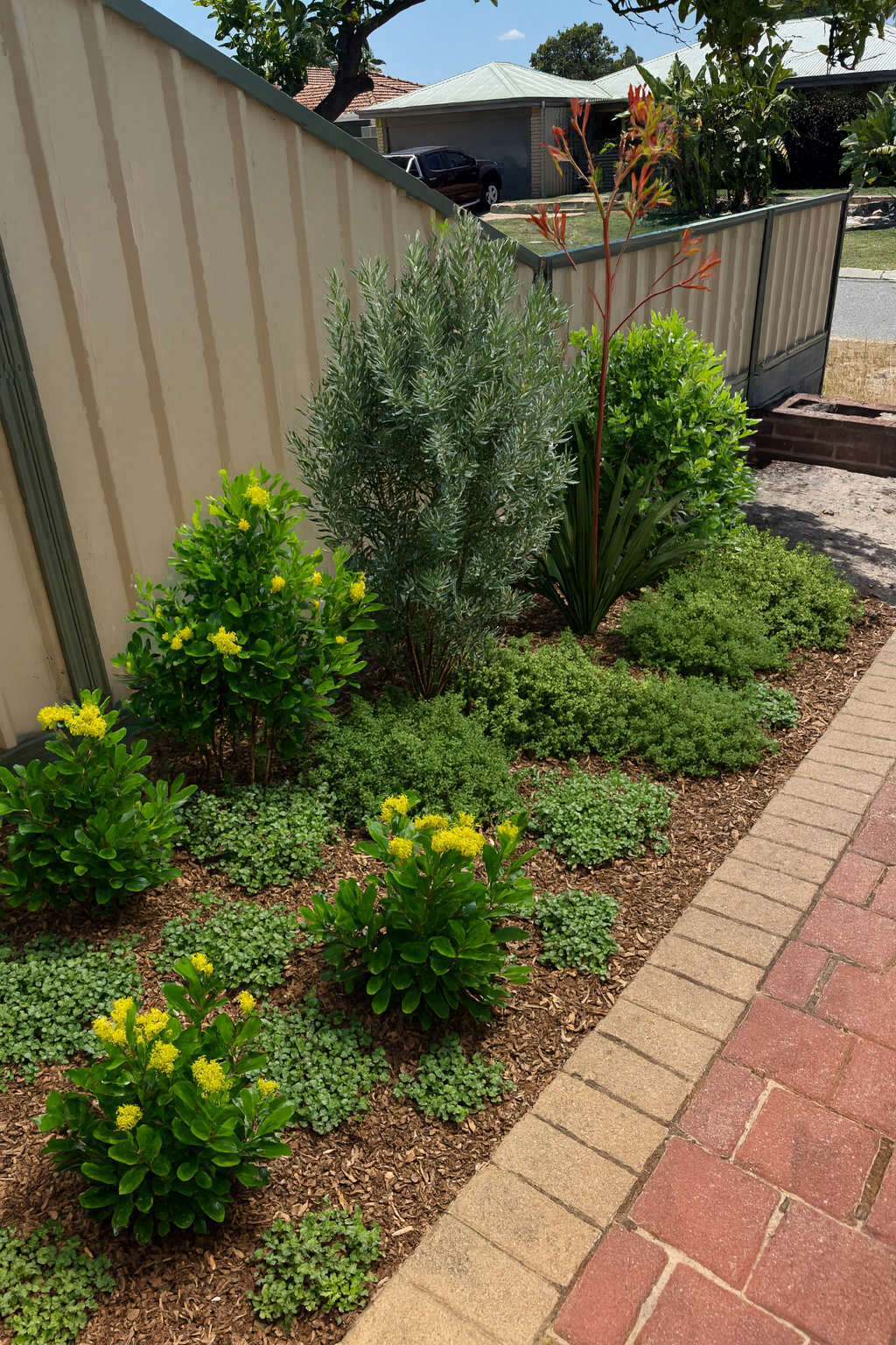 Once the backbone plants are in place, you can fill the lower areas with spreading groundcovers that will soften the space and tie everything together. Native options like myoporum, creeping boobialla, native mint bush groundcovers or even fan flower varieties will cover the bare soil quickly and help suppress weeds. Planting them in repeating clusters helps the space feel fuller and gives the whole garden bed a deliberate, cohesive look. After everything is planted, finish by mulching right across the bed to help with water retention and to give it a clean, finished appearance.