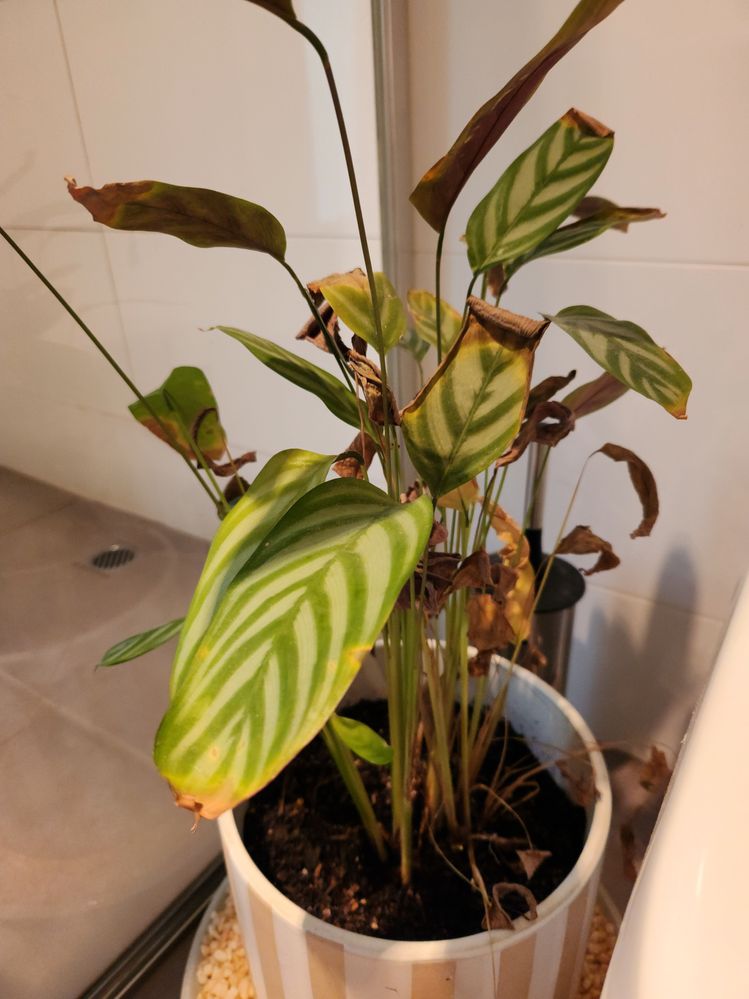 I have this plant in my bathroom. Its leaves have been increasingly browning off. It has been OK in here for a couple of months but I am worried. The bathroom gets filtered light and I give it about half a cup of water each week. The pot has a hole which fills the bottom plate. The soil feels slightly moist.