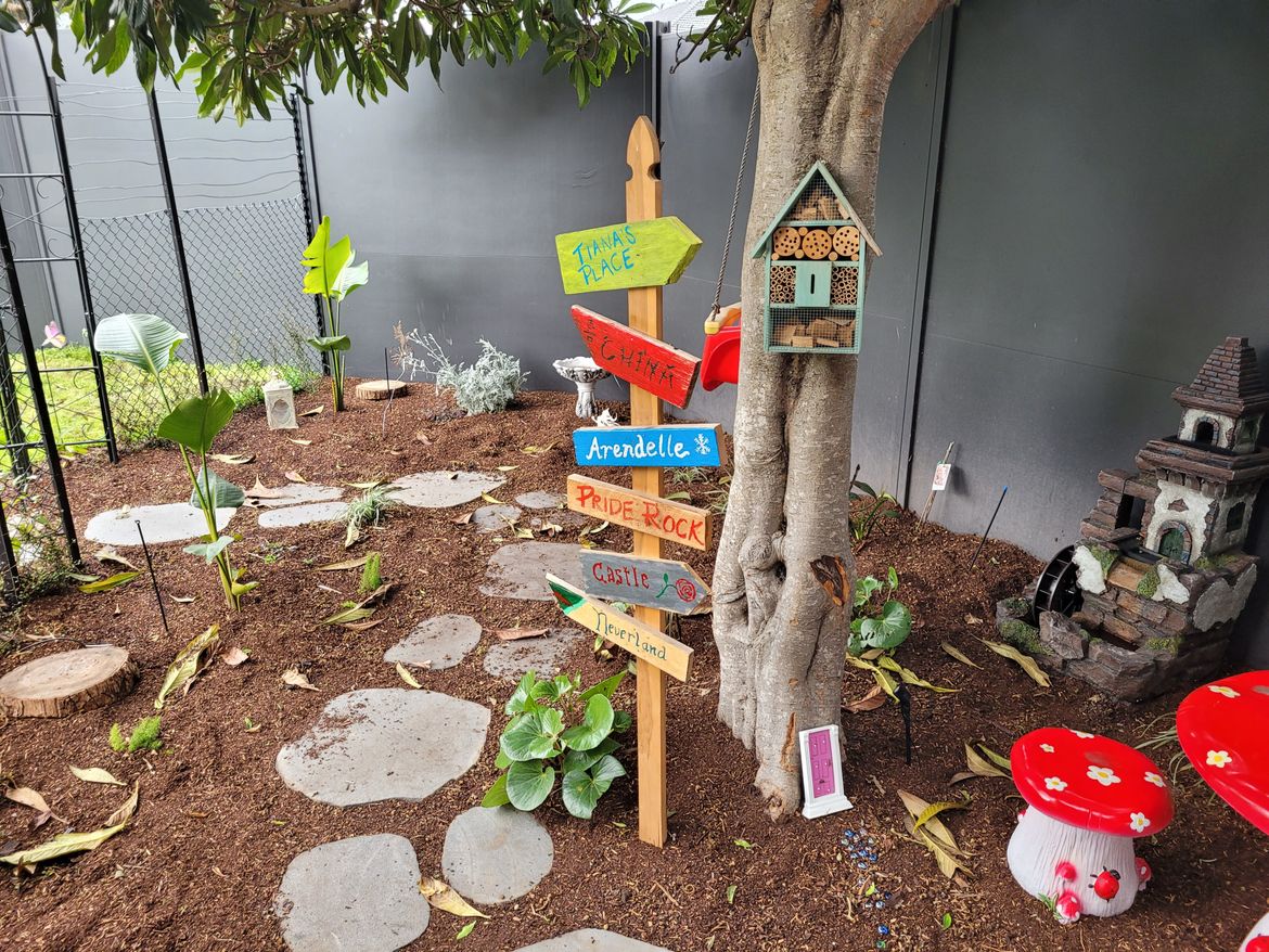 Thank you very much for sharing pictures of your landscaping project. It looks wonderful and really gives the entry area a fantastic fantasy vibe when coming in. the fairy castle and the mushroom furniture are a beautiful touch. The bee house is a great idea to invite insects in to pollinate the plants when the flowering season comes.