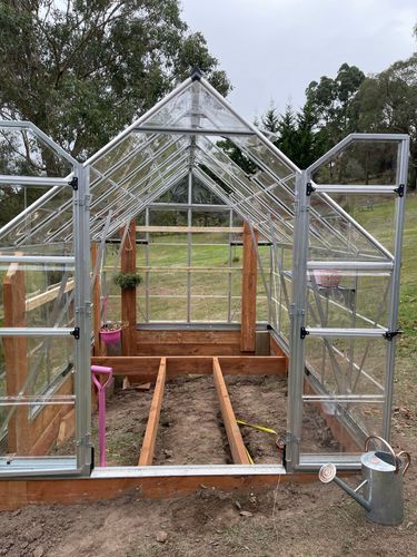 The greenhouse is a big project and does require a lot of patience, but well worth it in the end. You need to have a full day so that you can get it to a secured and safe stage and requires two people. We also added extra stability and support with upright sleepers snd cross Timbers onnthecsides that will cop the wind. We also have screwed greenhouse all around base to sleepers.