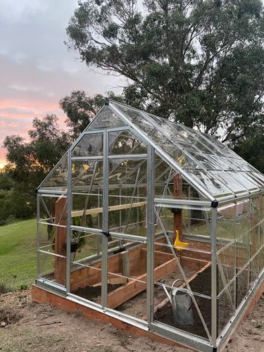 It has taken around 20 hours with the two of us putting it up (not including foundation base.) We are going to have soil beds either side with a crushed stone path down middle and then decked area at back for my pots. We will also be adding some timber sleeper shelves at the back of greenhouse.