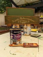 So... now I have my gorgeous stain, glowing stencil AND antique chalk board, I want to make sure it won’t all rot away – remember it will have plants in it!!! I used Integrain EXTERIOR Ultra Clear finish - a non-yellowing, water resistant, polyurethane finish in GLOSS – for that extra je ne se qui! Plus - even though it’s meant to look "old", it should feel young too!