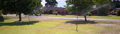 The job took 1 hour with some 19mm poly pipe,19mm hose clamps, 19mm elbow, 19mm T piece with a female 15mm connector, 19mm elbow with a female 15mm connector, 1200mm long "risers" with 15mm "joiner" connectors screwed onto the end so I could screw 15mm impact sprinklers on (all from memory I think its correct though lols)