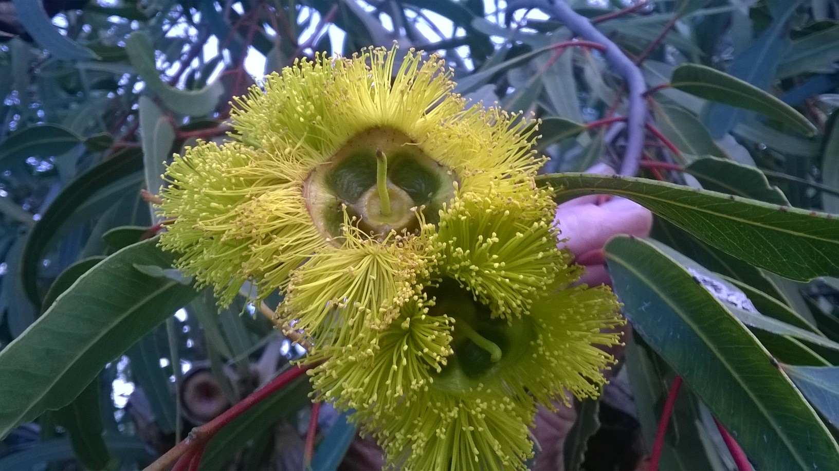 Now the flower. Eucalyptus erythrocorys has red caps, yellow flowers. Native birds love it.