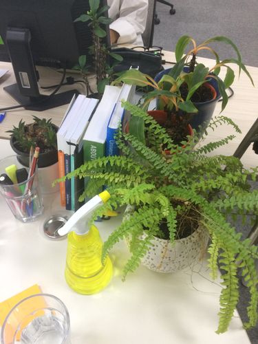 Just thought I'd share my desk garden with you all. It's super easy to maintain - all you need to do is keep an eye on water levels. I water most things about once a week. Plants like bamboo can actually live submerged in water, where as most other plants seen here would drown. I was also gifted a spray bottle which I use to mist the fern which it loves. Most ferns hate their foliage drying out.