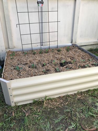 I have a galvanised raised bed measuring 900mm wide, 1200mm long and 300mm deep. The bed has stick and dried leaves as base and potting mix with sugarcane mulch.