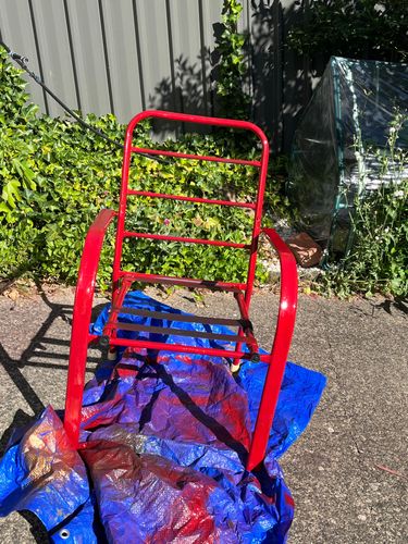I rescued the tubular steel outdoor chair from the neighbourhood kerbside. I tightened and renewed the screws where required, then cleaned it and applied a coat Rustcoat Heritage Red spray paint recently purchased from Bunnings for another project. I also added chair tips where required. I off to Bunnings tomorrow to find a suitable seat cushion in a contrasting colour. Rejuvenating a solid tubular steel cast off a good couple of hours work.