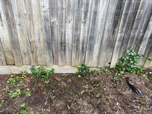 This looks very like periwinkle which is capable of growing vigorously and strangling or smothering everything in its path over time. I'd remove it while it is still small and controllable, and keep doing so until it disappears completely.