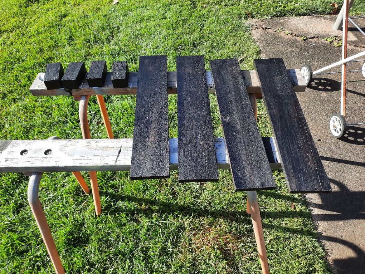 I cut each packer in half as they were roughly 1m long each and cut up an garden stake that we weren't using into 100mm long pieces (same height as palings). I had left over timber protector from my previous garden project so I painted all the pieces with that to help prevent rot etc. I screwed the pieces together with 40mm climacoat screws that I had left over from another project.
