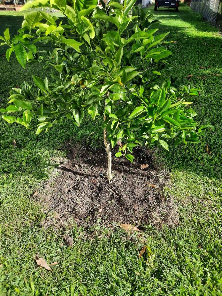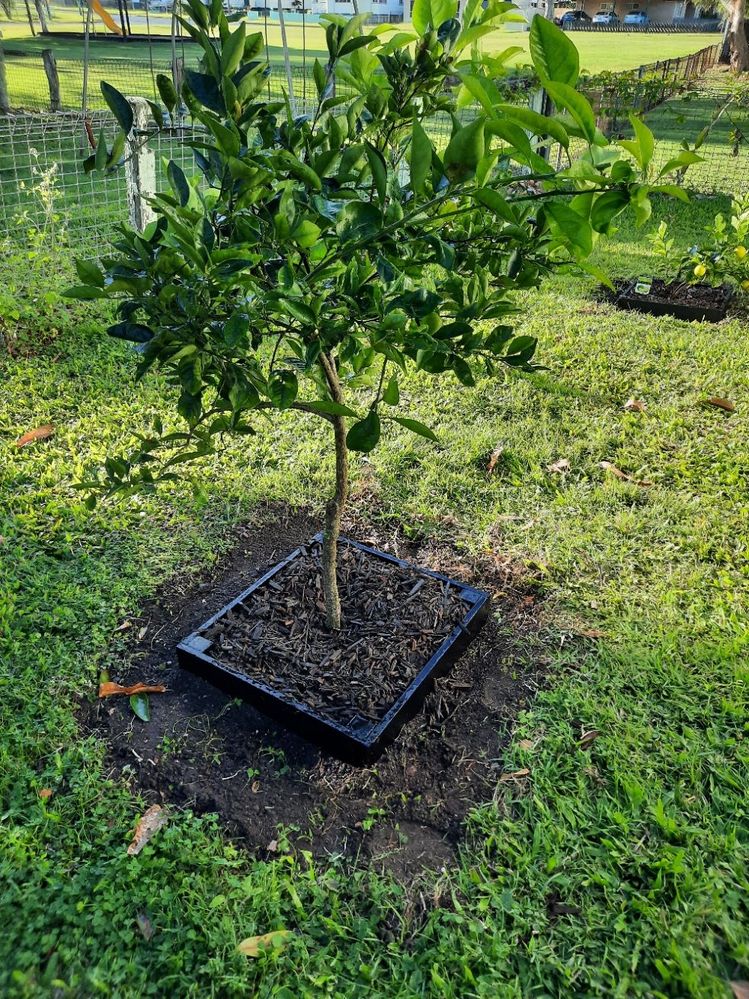 While the timber protector was drying, I weeded and fed the citrus trees and the following day, I put it all together - dug the surround in a little, then added extra garden soil and some mulch (both from Bunnings). I was careful to keep too much soil and mulch from around the base of the trees.