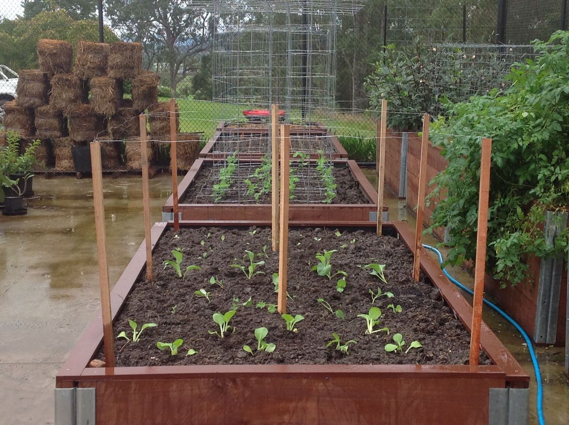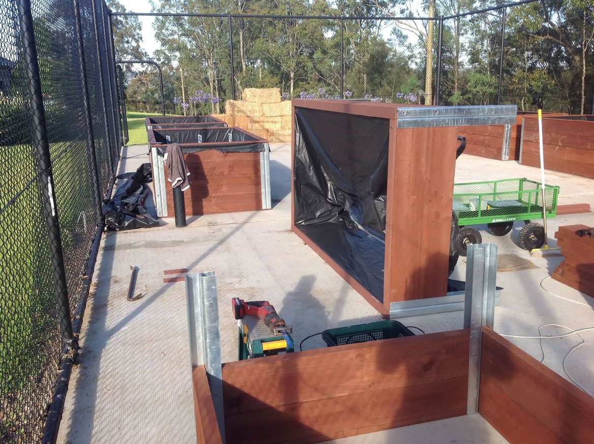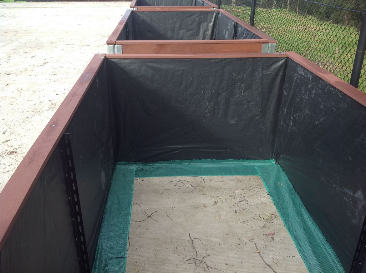 The beds are lined with building plastic with a layer of ecodeck top and bottom. They are braced with some stainless steel rope (to stop spreading on the long side) then filled with layers of compost, soil, manure etc.