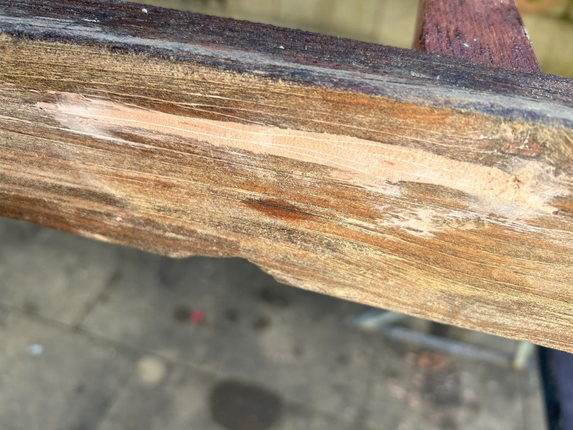 I cleaned out all the rot from numerous holes and cracks which I filled with Turbo Builders Bog and scratched some lines into the bog to imitate the wood grain. I also removed one of the arm supports which was loose, installed new dowels and glued it back into place.