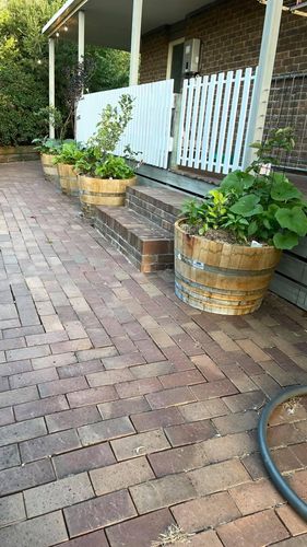 The next step after having the small raised beds was to get 4 half wine barrels. I set them up end January and the seedlings grew very quickly. All from Bunnings and compost from my Maze Barrel composter. I also planted a couple of Citrus snd 2 Crepe Myrtles in them that I picked up on clearance, perfect. I decided I needed a fifth for the other corner and have planted my dwarf fig and dome purple cauliflower. In all of the barrels I have planted one bee attracting herb.