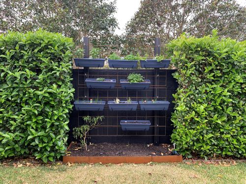 Thanks Eric, I used 100x100mm 2.4M H4 treated pine posts, anchored with 20mm dynabolts into the wall, painted with Taubmans exterior black paint. All sourced from Bunnings! Here's a current photo where we've added another pot, while it doesn't sit right with my symmetrical brain, we're trying to get the transplanted chilli plant to take & hope it grows up the frame (not as good at gardening as I am at building though! lol). The reo has started to rust which looks cool.