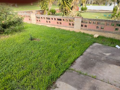 Thank you for the responses. I have attached photos - not sure if they're clear enough! The drop in the 'lawn' is between 20 & 30cm just in that corner. I want to raise it by no more than 20cm to minimise water run off. I would use 2 bricks high then reduce to one brick so that the top of the wall remains level, and it would be a straight line from the fence, where the brick is, following the path toward the camera. The 3 metre mark along this path is at the concrete join with grass growing in it. I do not want to go more than 2 bricks high, really, just enough to make it reasonably level. I've worked out that I will need about 25 bricks. Thank you.
