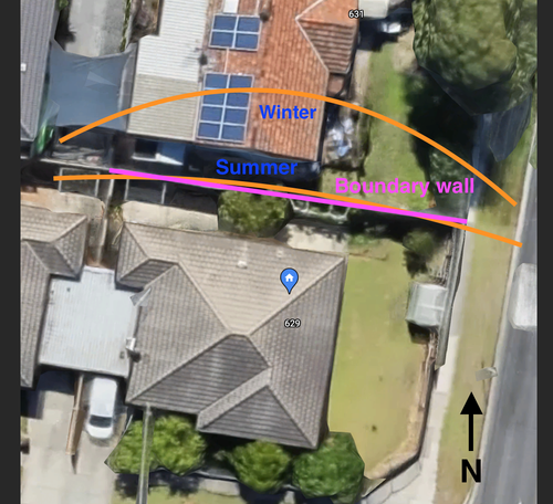 We're currently in October (so mid spring), and I've done some measurements from the top of the bed to the height at with there is contact with sun light. You can see from the photos below for the raised garden bed, this is around 50cm and for the lower part, this would be around 1.5m in height. Of course in winter, this will be much higher.