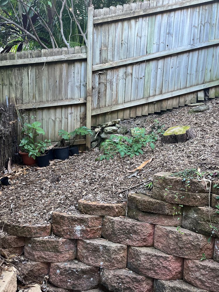 I have just had three massive Cypress pines cut down and now am left with this sloped area behind a retaining wall. Cant really use it for anything apart from the dog goes up there but would like to make it look nice. I am thinking Australian natives and something to cover up the fence. I need something low maintenance. I'm in Sydney - northern beaches. Ideas welcome.