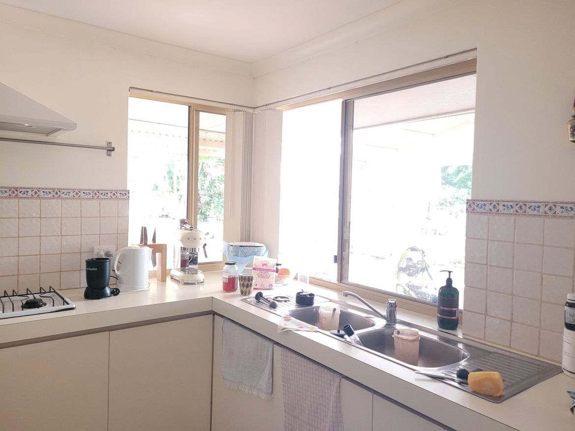 Items that age your kitchen are the laminate benchtops, border tiles on your splashback, white rangehood and cooktop, the brick on the bench return and verticle blinds.